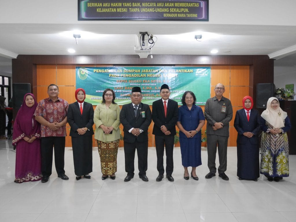 Sampit – Selasa, 23 September 2025 pukul 10.00 WIB, bertempat di Ruang Aula Lantai 2 Pengadilan Negeri Sampit, dilaksanakan acara Pelantikan dan Pengambilan Sumpah Jabatan Ibu Septa Sujiati Eka Setia, S.E. sebagai Sekretaris Pengadilan Negeri Sampit beserta Ibu Laili Rahmah, A.Md., S.H., M.H. sebagai Kasubbag Kepegawaian, Organisasi dan Tata Laksana Pengadilan Negeri Sampit dan Bapak Achmad Syahruji, A.Md. sebagai Kasubbag Perencanaan, Teknologi, Informasi dan Pelaporan Pengadilan Negeri Sampit.