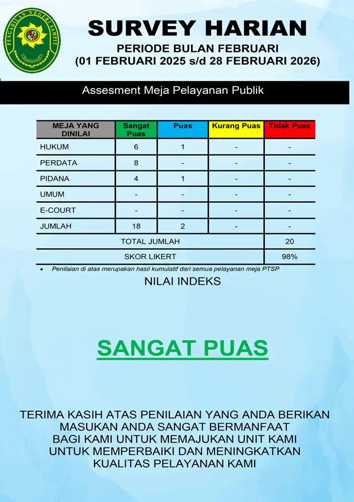Terimakasih atas penilaian yang telah Anda berikan. Masukan Anda sangat bermanfaat bagi kemajuan satuan kerja kami agar terus memperbaiki dan meningkatkan kualitas pelayanan bagi masyarakat.