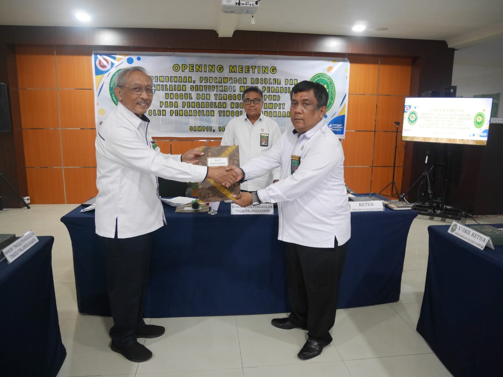 Secara simbolis kegiatan dimulai dengan penyerahan Nota Kesepahaman oleh Ketua Tim Pengawasan Reguler dan Penilaian Sertifikasi Mutu Peradilan Unggul dan Tangguh kepada Ketua Pengadilan Negeri Sampit.