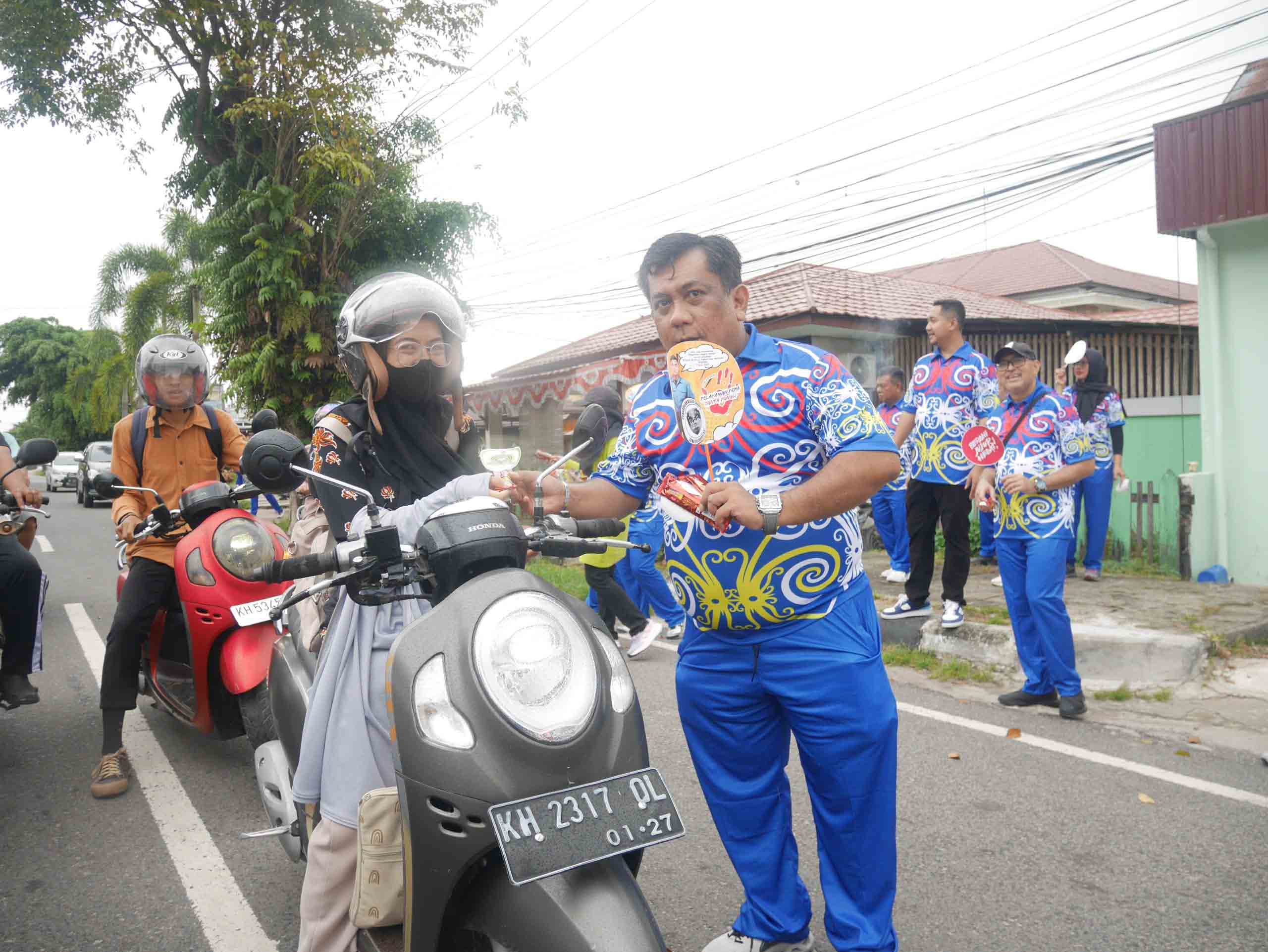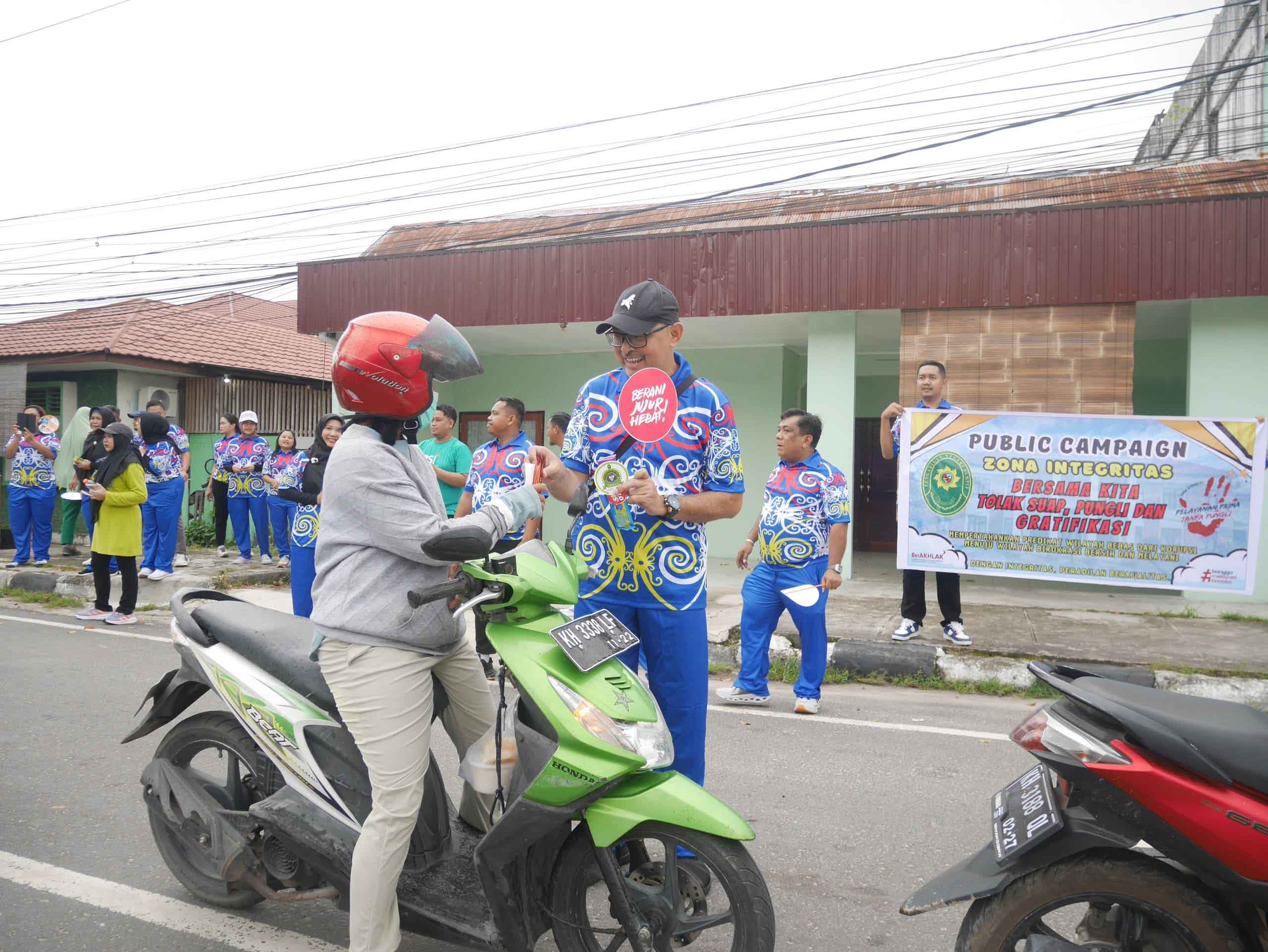 PN SAMPIT – Jumat, 28 Februari 2025 bertempat di depan Gedung Pengadilan Negeri Sampit jalan HM. Arsyad – A. Yani Sampit Kabupaten Kotawaringin Timur, Pengadilan Negeri Sampit Kelas IB telah mengadakan kegiatan “PUBLIC CAMPAIGN” dalam mempertahankan predikat Wilayah Bebas dari Korupsi (WBK) menuju Wilayah Birokrasi Bersih dan Melayani (WBBM). Ketua Pengadilan Negeri Sampit Kelas IB Bapak Benny Octavianus, S.H., M.H., bersama Kepala Kantor Pelayanan Perbendaharaan Negara (KPPN) Sampit Bapak Joko Tri Prasetyo serta perwakilan dari Bank Syariah Indonesia (BSI) Cabang Sampit beserta seluruh pegawai turun kejalan untuk membagikan coklat dan sticker Zona Integritas.